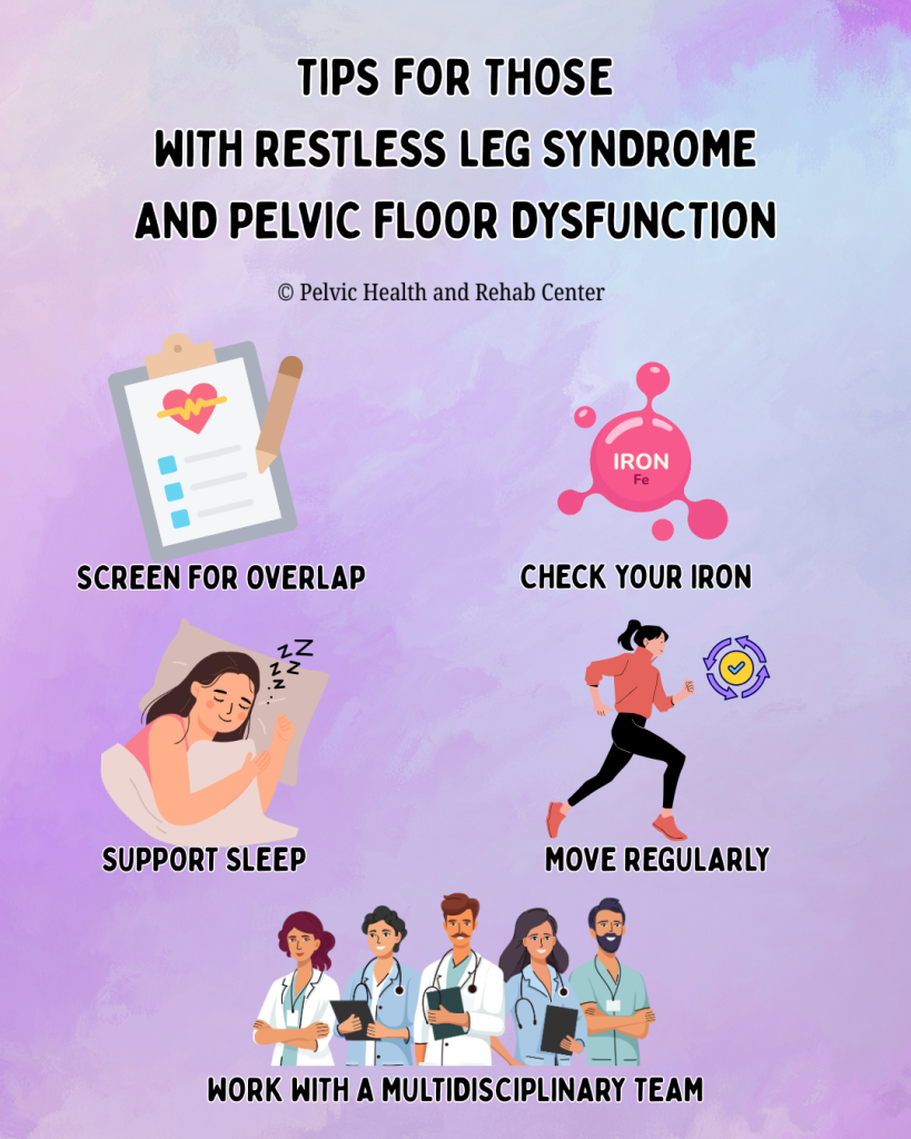 Check your iron: Ferritin levels below 75 µg/L are linked with RLS; optimizing iron can help both leg and pelvic symptoms.
